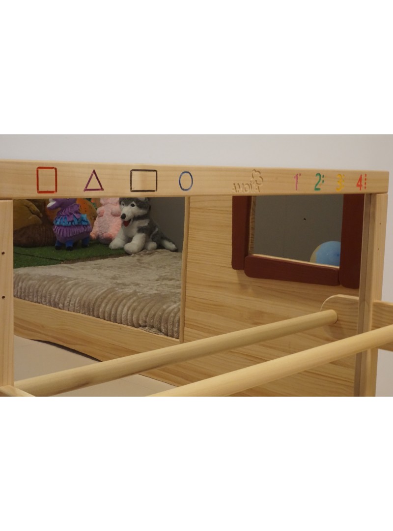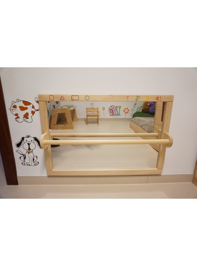 Cada detalle grabado en el marco aporta un aire de exclusividad y tradición artesanal, convirtiéndolo en una pieza decorativa funcional ideal para hogares, guarderías y espacios Montessori. Fabricado con materiales de alta calidad y acabado con un tratamiento ecológico, este espejo no solo es seguro y estable, sino que también armoniza con cualquier ambiente infantil