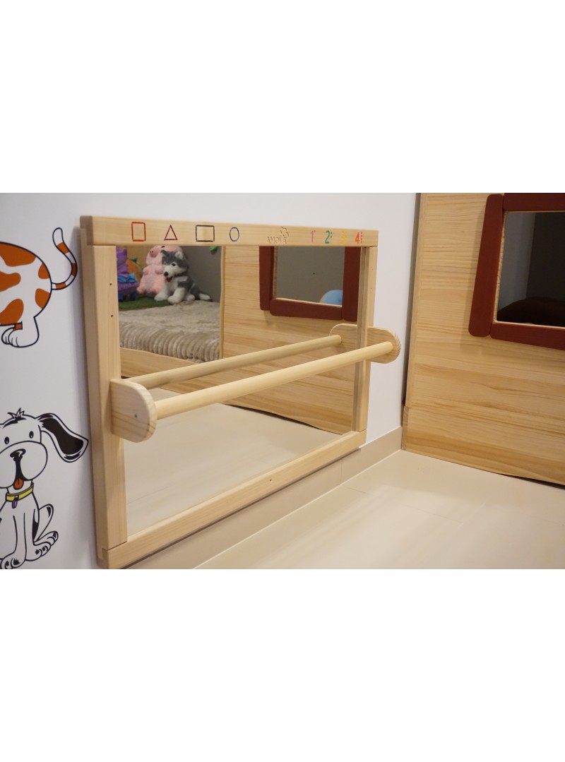 Espejo de madera con grabados artesanales para el desarrollo infantil Nuestro espejo con marco de madera maciza ha sido mejorado con exquisitos grabados que realzan su estética y le confieren un carácter único. Diseñado especialmente para el desarrollo y la exploración de los más pequeños, cuenta con una barra de apoyo resistente que favorece el equilibrio y la coordinación motriz.